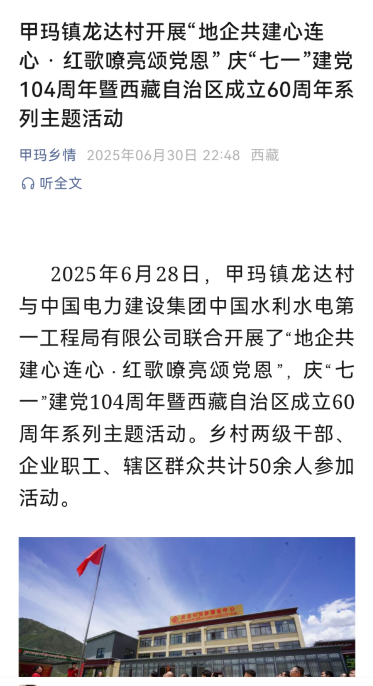 2025年6月28日,甲瑪鎮(zhèn)龍達(dá)村與中國(guó)電力建設(shè)集團(tuán)中國(guó)水利水電第一工程局有限公司聯(lián)合開展了“地企共建心連心?·?紅歌嘹亮頌黨恩”,慶“七一”建黨104周年暨西藏自治區(qū)成立60周年系列主題活動(dòng)。鄉(xiāng)村兩級(jí)干部、企業(yè)職工、轄區(qū)群眾共計(jì)50余人參加活動(dòng)。 本次活動(dòng)深入貫徹黨的二十大精神和習(xí)近平總書記關(guān)于基層治理的重要論述,通過(guò)深化地企共建機(jī)制,推進(jìn)地企基層黨組織活動(dòng),提升黨建質(zhì)量,增進(jìn)黨組織間的交流,實(shí)現(xiàn)黨員互動(dòng)、活動(dòng)互聯(lián)、資源互享、共促發(fā)展。 活動(dòng)現(xiàn)場(chǎng),全體黨員和群眾莊嚴(yán)肅穆,面向五星紅旗奏唱國(guó)歌,并重溫入黨誓詞。錚錚誓言中,大家牢記初心使命,堅(jiān)定理想信念,黨性得到進(jìn)一步淬煉,工作熱情和無(wú)私奉獻(xiàn)精神也被充分激發(fā)。隨后,全體人員參觀了龍達(dá)村紅色教育中心與黨史展覽館,賡續(xù)紅色血脈。 龍達(dá)村“七一”系列活動(dòng)共呈現(xiàn)了包括獨(dú)唱、合唱在內(nèi)的10個(gè)節(jié)目,《紅旗飄飄》《北京的金山上》等經(jīng)典紅色歌曲被激情演繹,演員們用激昂歌聲抒發(fā)對(duì)祖國(guó)和黨的熱愛,唱響紅色主旋律。此次文藝匯演以“地企共建”為紐帶,以群眾喜聞樂(lè)見的形式推動(dòng)基層文化活動(dòng)開展,豐富了群眾文化生活,凝聚人心,厚植了愛黨愛國(guó)情懷。 匯演后,開展了老黨員慰問(wèn)走訪活動(dòng),為龍達(dá)村10位老黨員代表送上慰問(wèn)品,獻(xiàn)上潔白哈達(dá)與祝福。前往藏族同胞家中慰問(wèn)老黨員,慰問(wèn)人員仔細(xì)詢問(wèn)他們的身體、子女工作及生活需求等情況,并送去水果、米、油等物資。旦增平措肯定了老黨員們發(fā)揮的模范帶頭作用,希望他們繼續(xù)關(guān)心支持西藏發(fā)展,共建美好家園。張濤表示,企業(yè)將積極擔(dān)當(dāng)社會(huì)責(zé)任,關(guān)心老黨員生活,提供精準(zhǔn)溫暖的服務(wù)。 龍達(dá)村此次活動(dòng)緊密結(jié)合“鑄牢中華民族意識(shí)共同體,開創(chuàng)基層黨建新篇章”的工作大局,聚焦民生需求與企業(yè)發(fā)展,搭建資源共享平臺(tái),推動(dòng)黨建工作成果轉(zhuǎn)化為服務(wù)地方經(jīng)濟(jì)、促進(jìn)民族團(tuán)結(jié)的實(shí)際效能,為鑄牢中華民族共同體意識(shí)提供堅(jiān)實(shí)的組織保障和實(shí)踐支撐。 https://mp.weixin.qq.com/s/D2k-8Y3iGLlJyIsZyVmabQ |